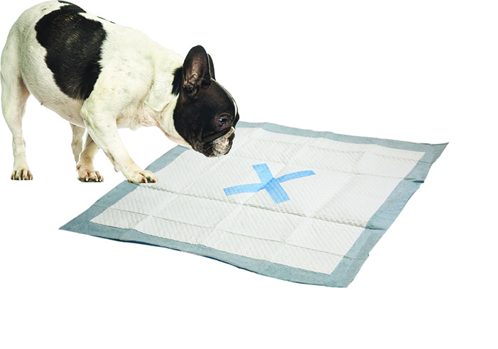 Les bandes adhésives fixent l'alèse sur le sol. Le "X" parfumé avec des phéromones attire le chien.